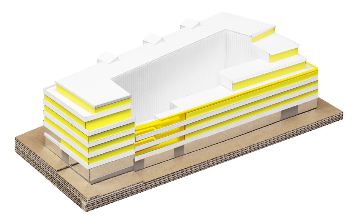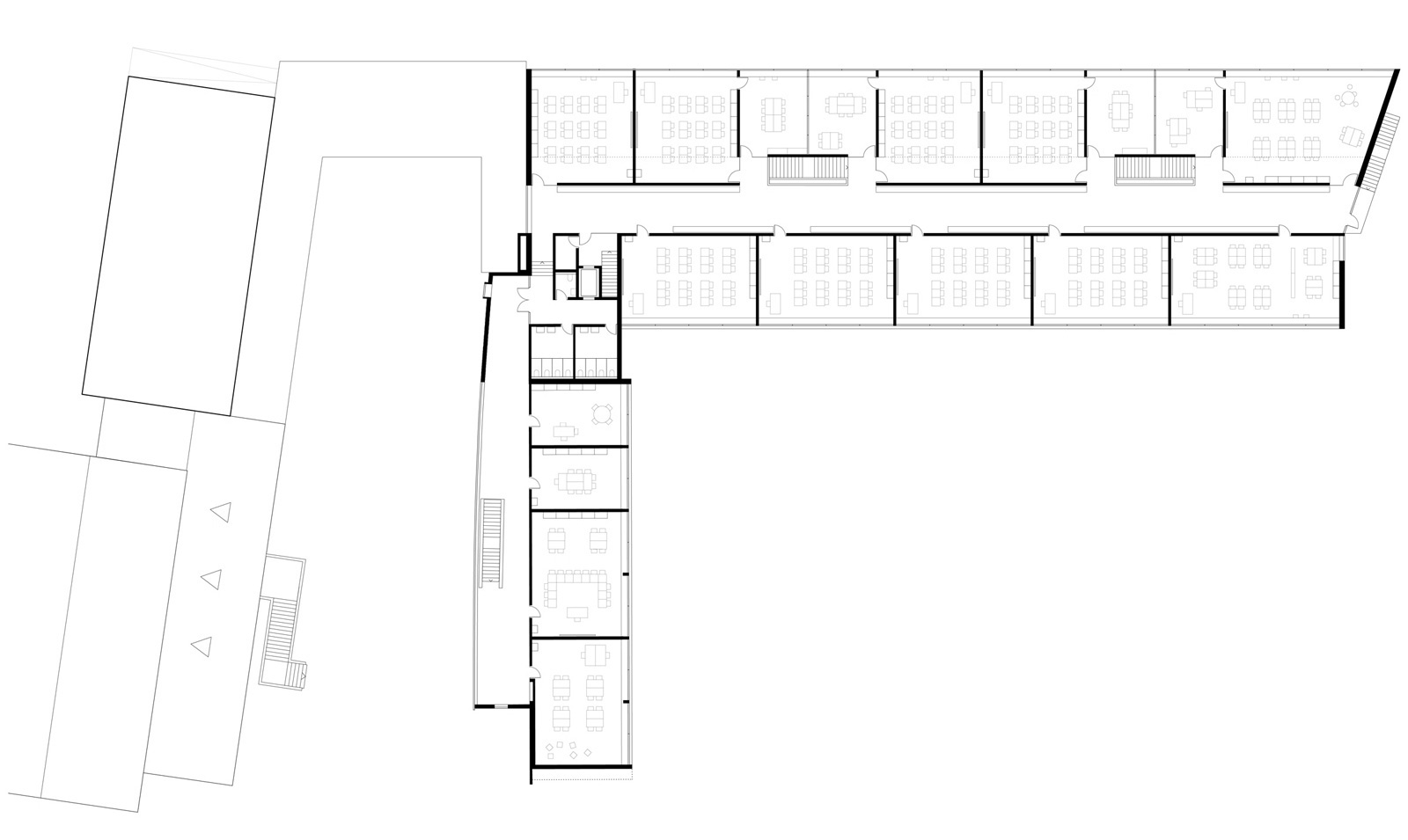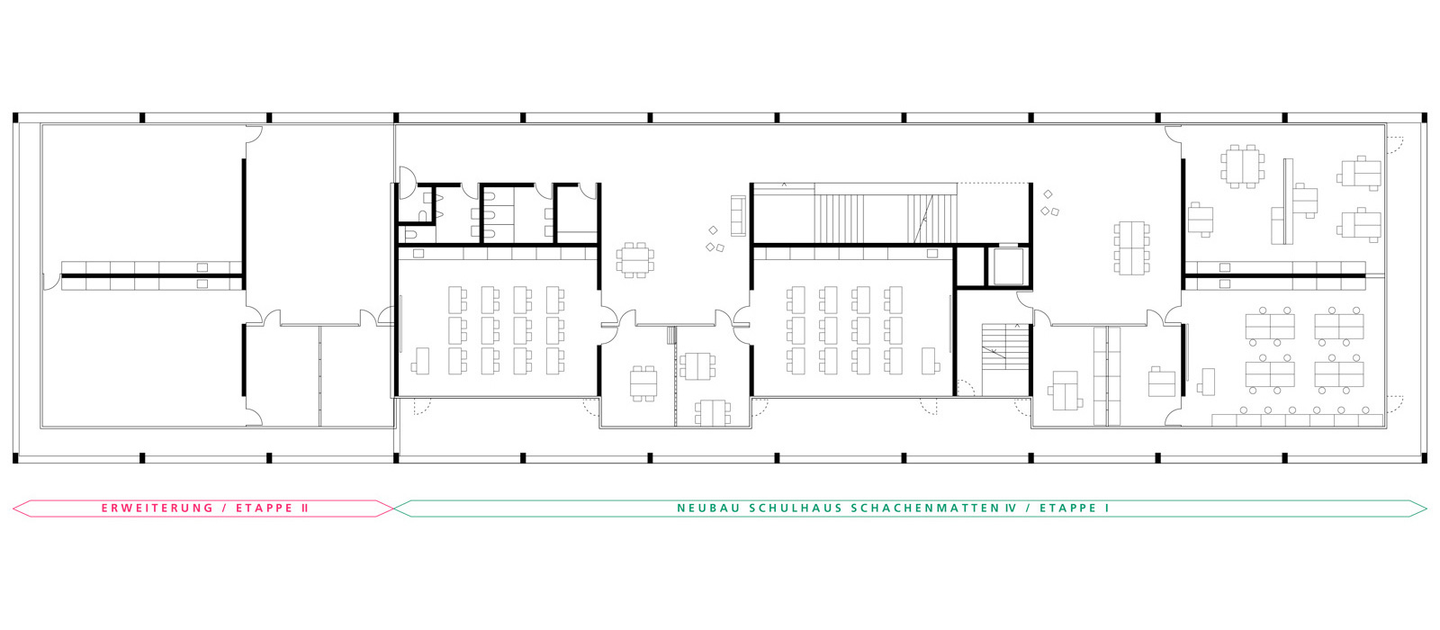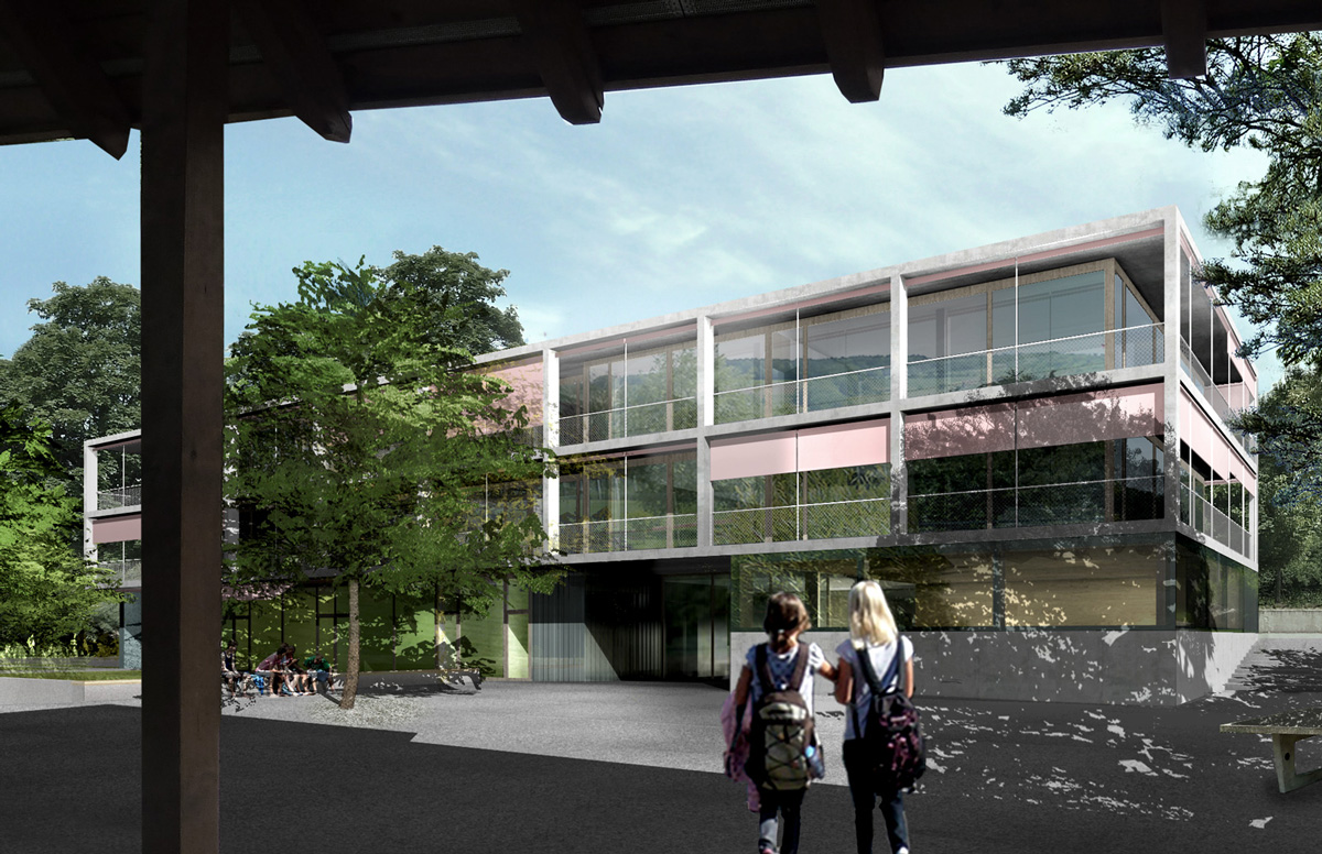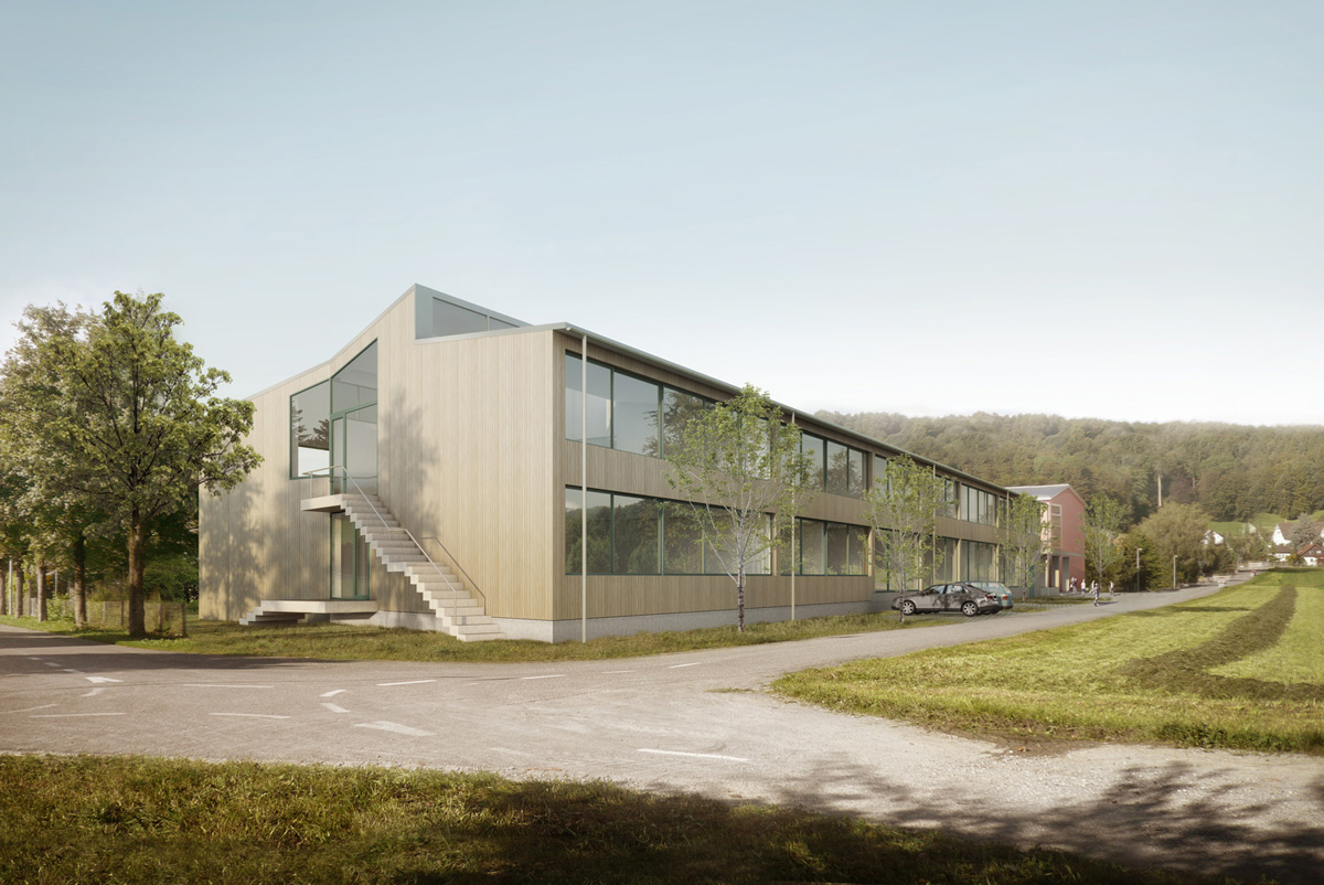 Die Schulanlage Schafisheim ist über Jahrzehnte kontinuierlich gewachsen, der Mittelpunkt bildet der Pausenhof mit einer eindrucksvollen Blickachse zwischen dem Schlössli und der weiten Landschaft. Das Projekt schlägt vor, das Gelbe Schulhaus mit einem zweigeschossigen Anbau zu erweitern. Ein übergreifendes Dach verbindet die neuen und bestehenden Bauteile zu einem neuen Ganzen. Ein nach Norden gerichtetes Oblicht in der ganzen Länge belichtet die tiefen Klassenzimmer und die beiden neuen Treppenanlagen. Der breite Mittelgang wird zum Begegnungsort für die Schüler aller Klassenstufen. Eine äussere Fassadenverkleidung in Holz verleiht dem Bau eine einheitliche Erscheinung, das ausladende Dach und die langen Brüstungsbänder unterstreichen die Horizontalität des Baukörpers. Als Kontrast zu der leichten Fassade werden im Aussenraum Elemente in Sichtbeton erstellt, die den Hauptkörper umrahmen.