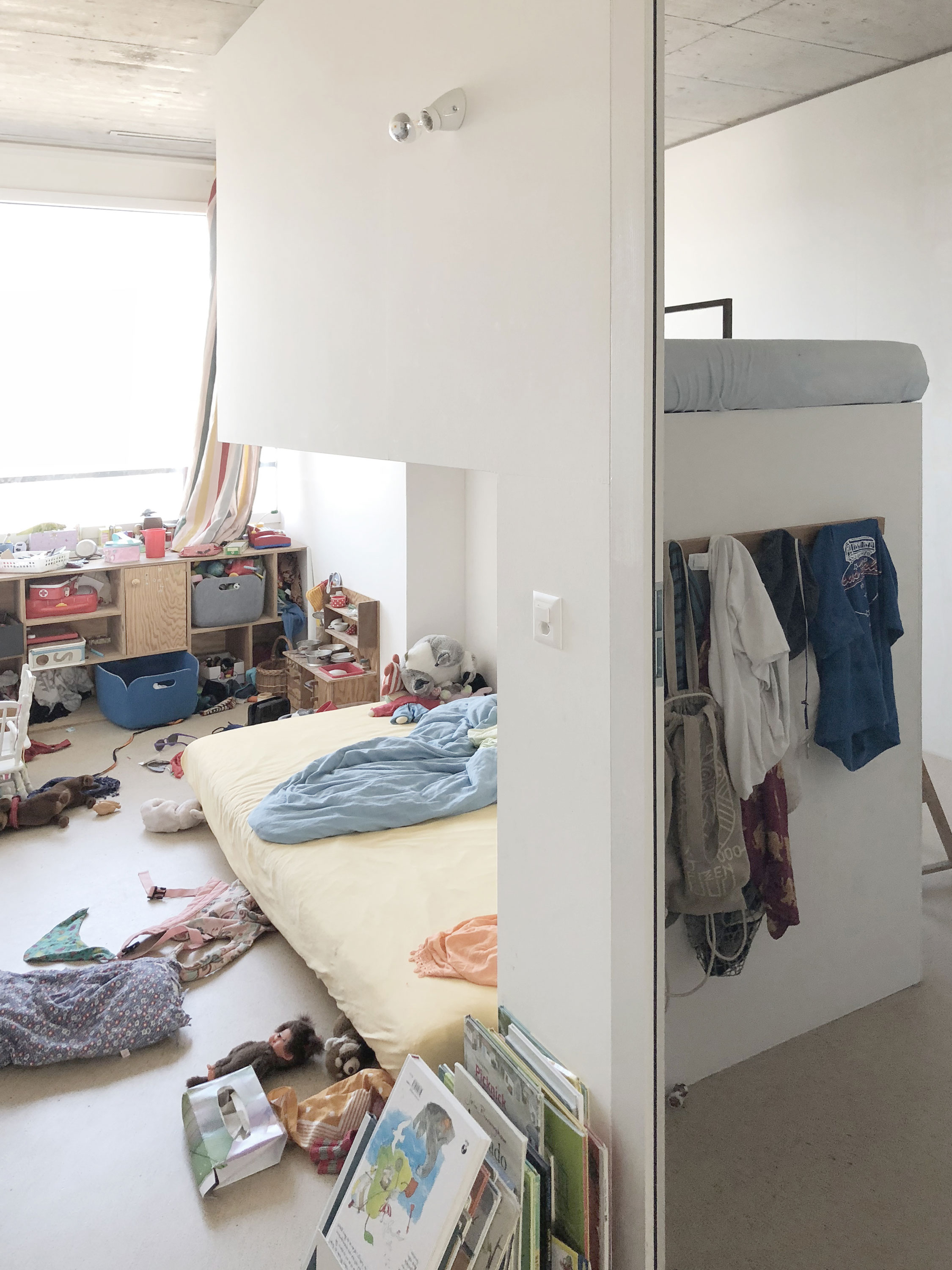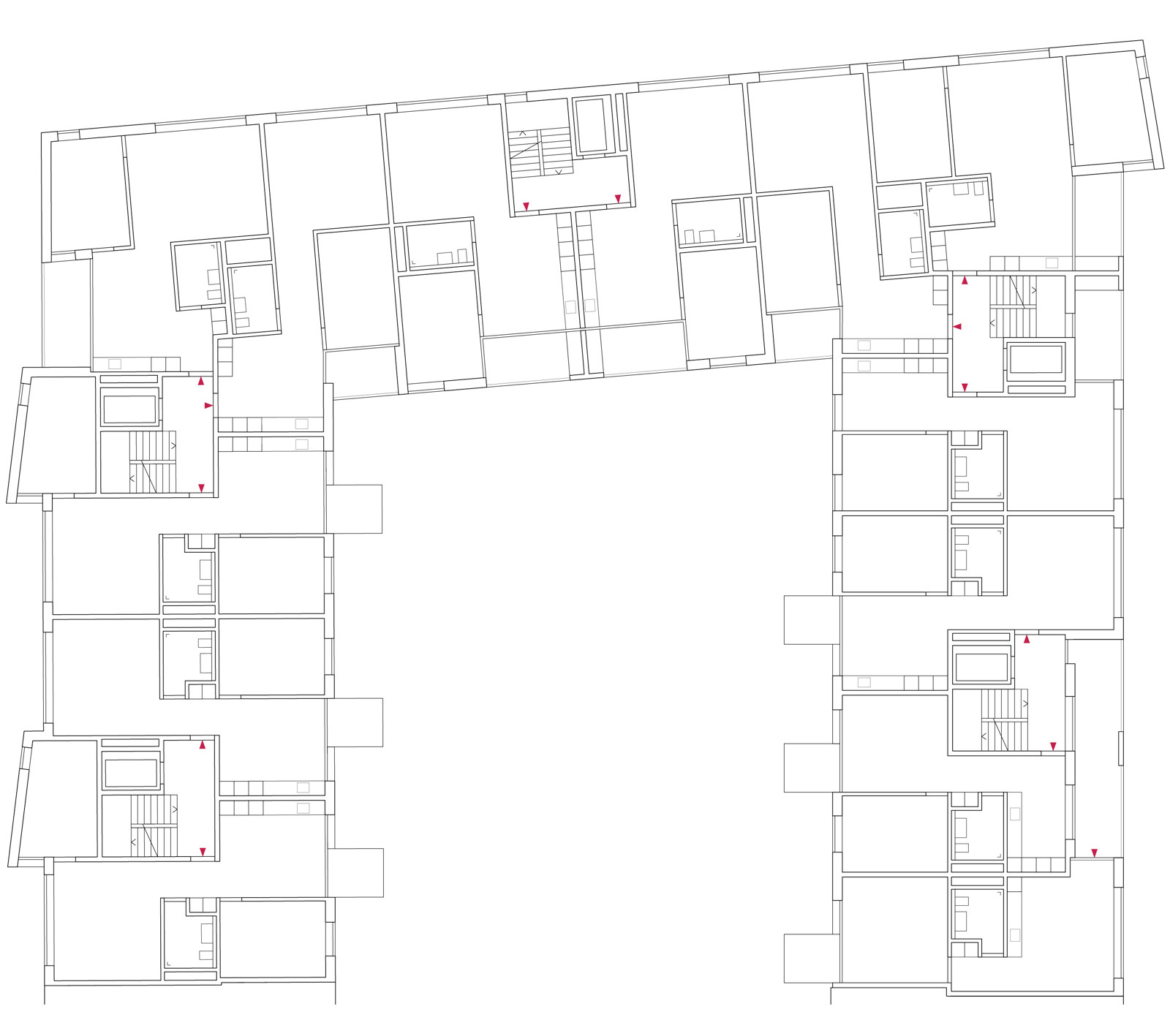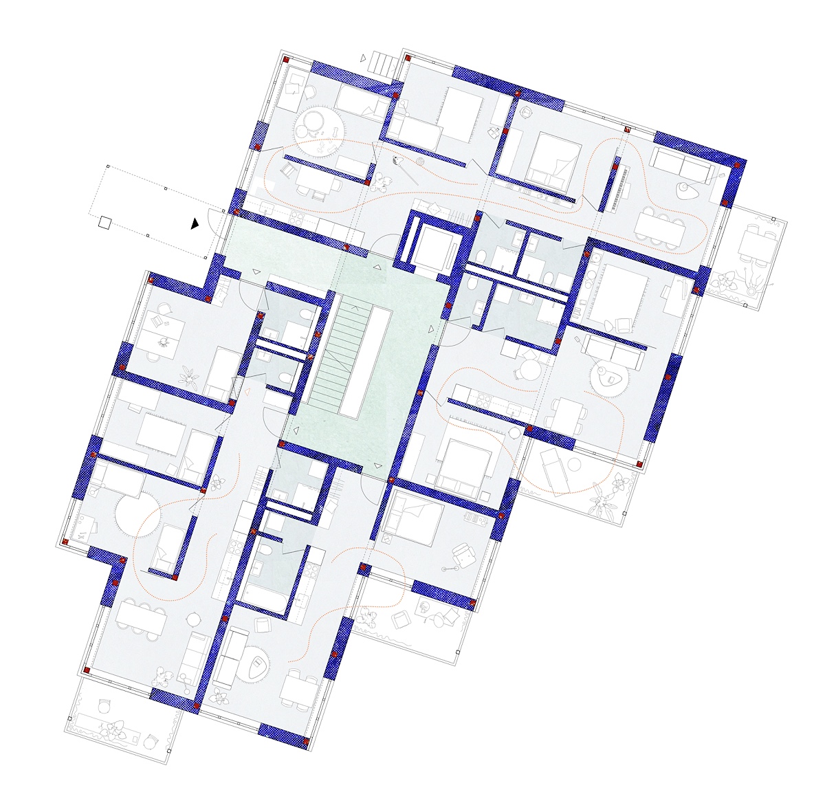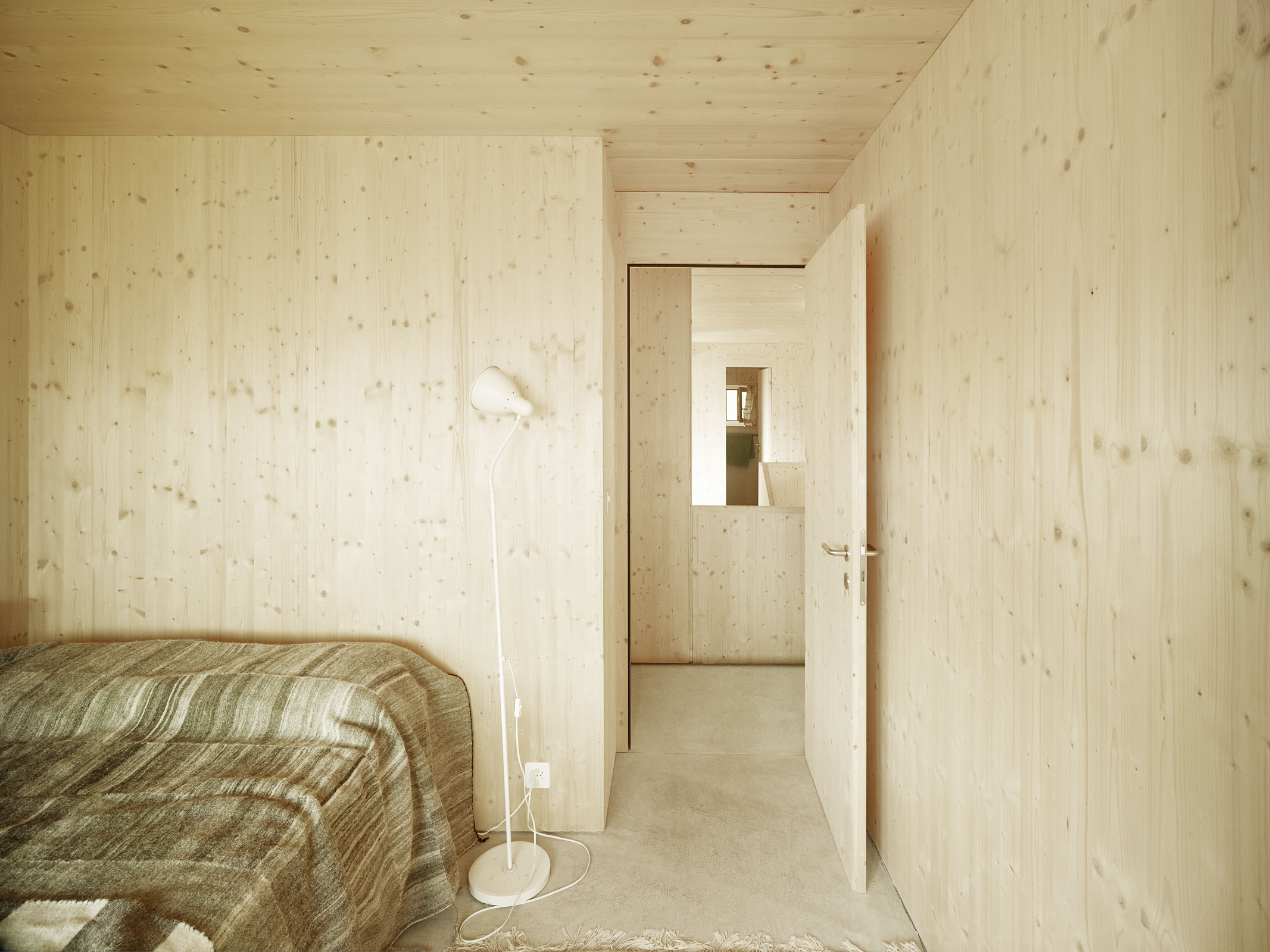 Alle Geschosse sind zweispännig angelegt. Durch die Lage quer zum Hang profitieren alle Zimmer gleichermassen vom Blick entlang der weiten Hügellandschaft und zum See. Im Mittelgang schaffen einläufige Treppen grosszügige vertikale Verbindungen. Die Tragstruktur des Gebäudes beschränkt sich auf ein Minimum, damit in der Nutzung oder zukünftigen Veränderungen eine grosse Flexibilität zur Verfügung steht.