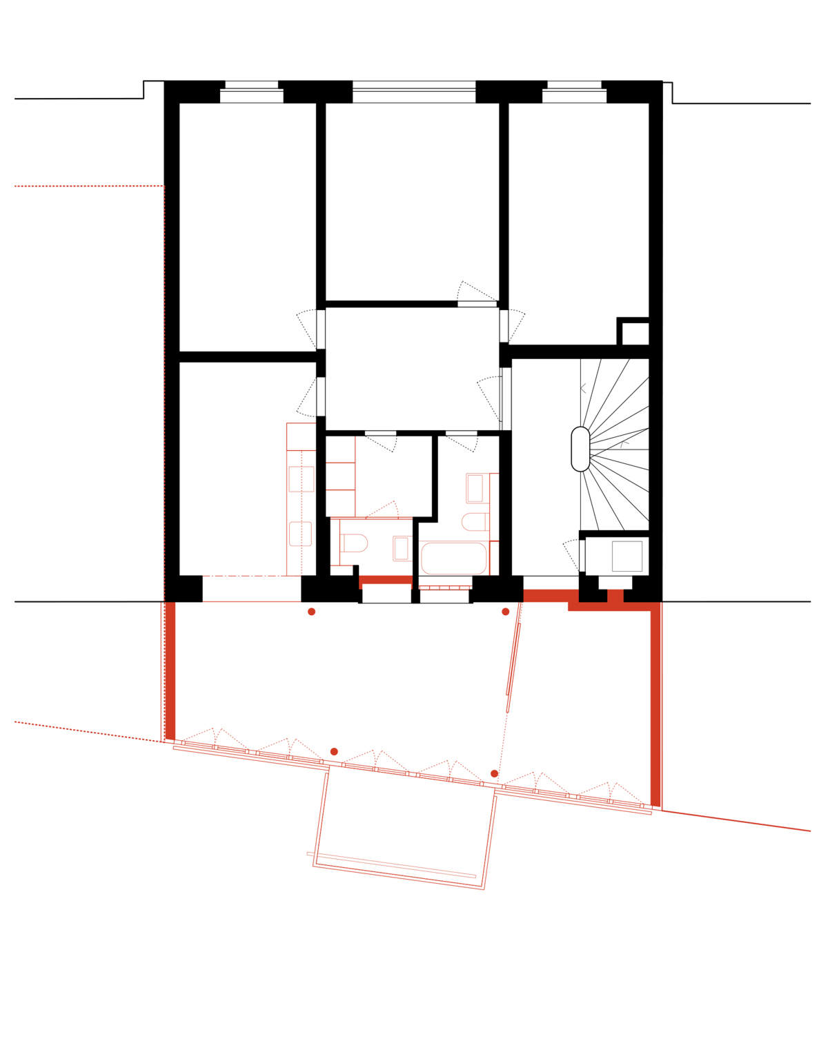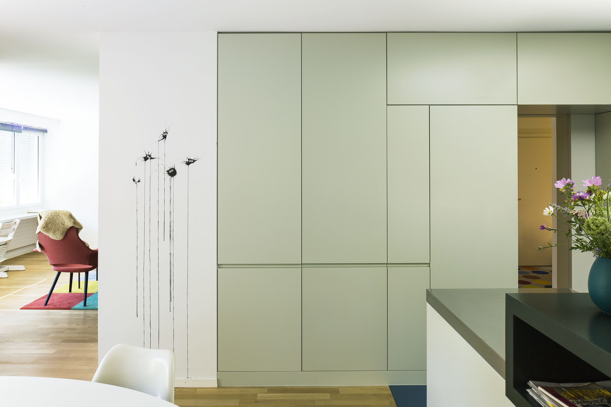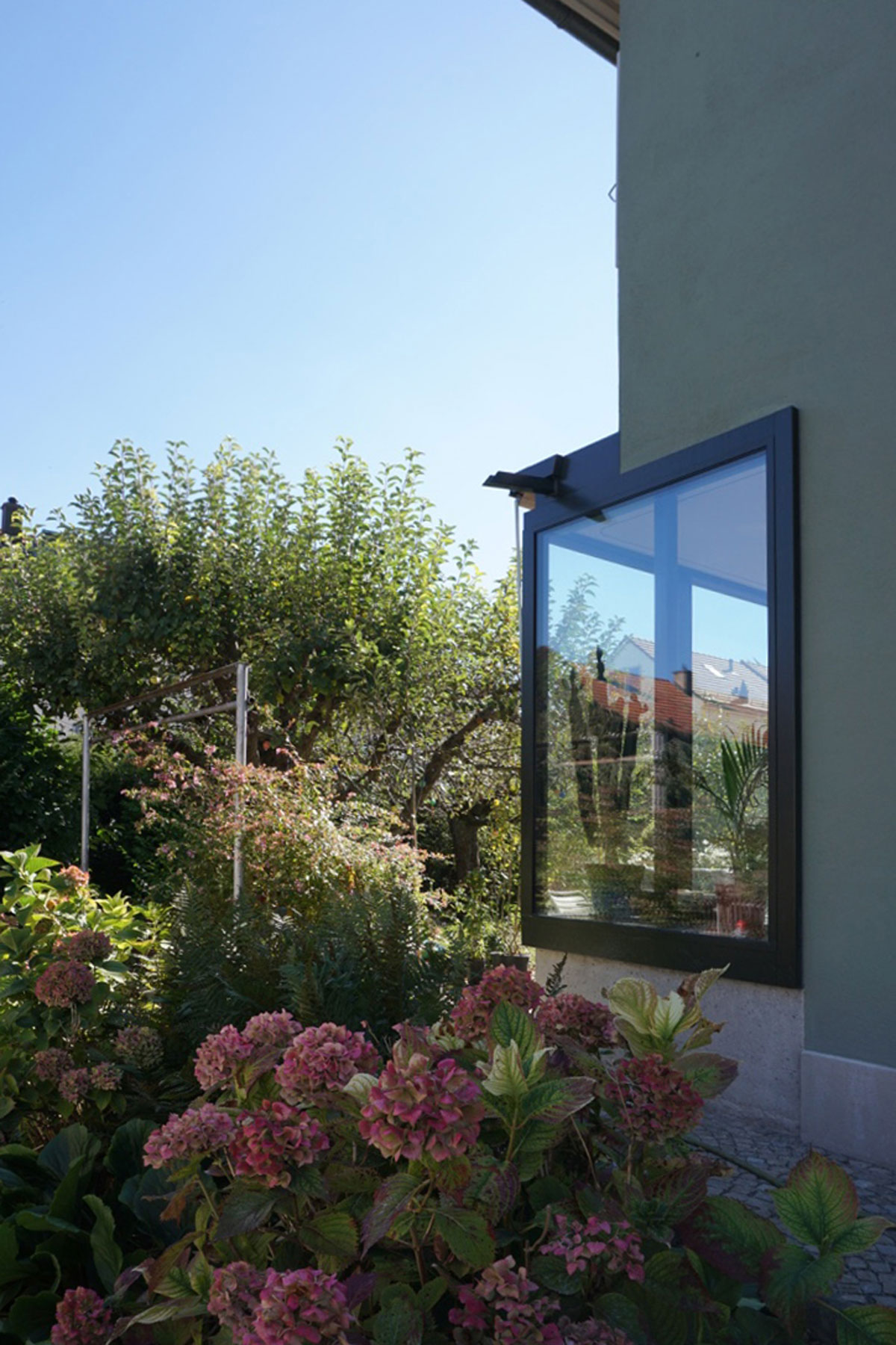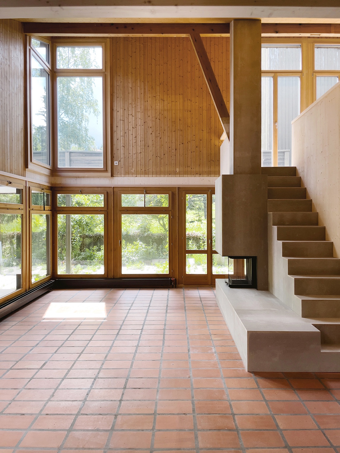 Das Reihenhaus aus den 30er Jahren liegt im «Blüemliquartier» in Zürich-Altstetten, eine denkmalgeschützte Siedlung im Geiste des Gartenstadtideals. Durch kleine lokale Eingriffe sowie durch eine Reorganisation der Bäder und des Dachgeschosses wurde das Haus auf die spezifischen Bedürfnisse der Familie angepasst. Neue Rundläufe schaffen eine Grosszügigkeit und Offenheit trotz eher kleinen Geschossflächen. Ein neuer Anbau mit Filigranverglasung erweitert den Wohnraum auf eine zeitgemässe Grösse und öffnet ihn grosszügig in den Garten mit schönem alten Obstbaumbestand.