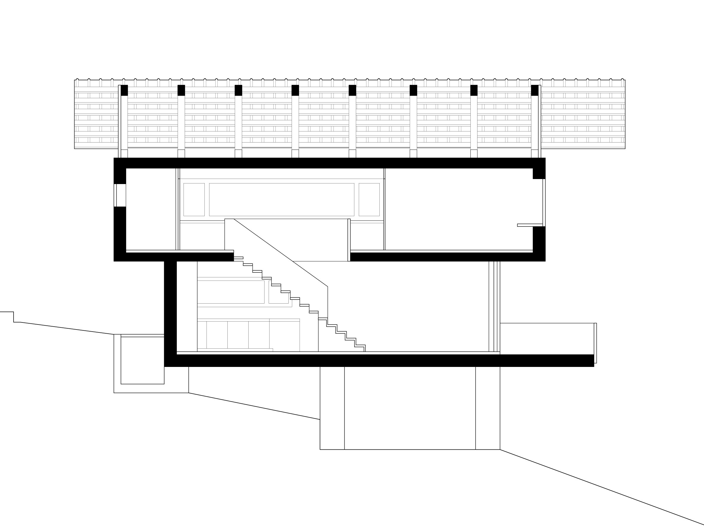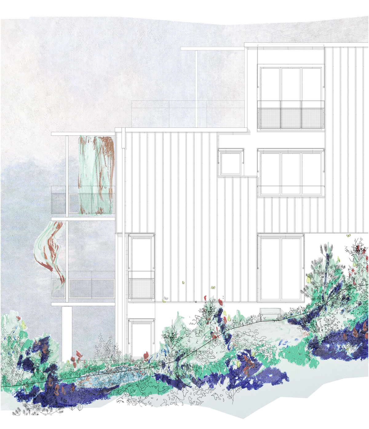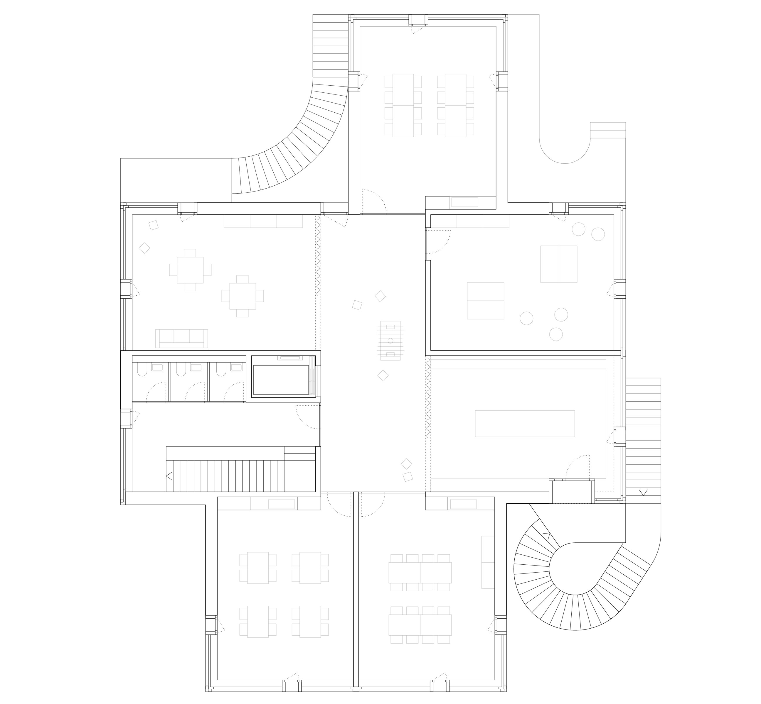 Die Topographie wird genutzt, um auf abgestuften Terrassen verschiedene spezifische Aussenräume anzulegen, die jeweils direkt den angrenzenden Innenräumen zugeordnet sind. Dies ermöglicht eine räumliche und funktionale Entflechtung der verschiedenen Aussenräume und Zugänge.