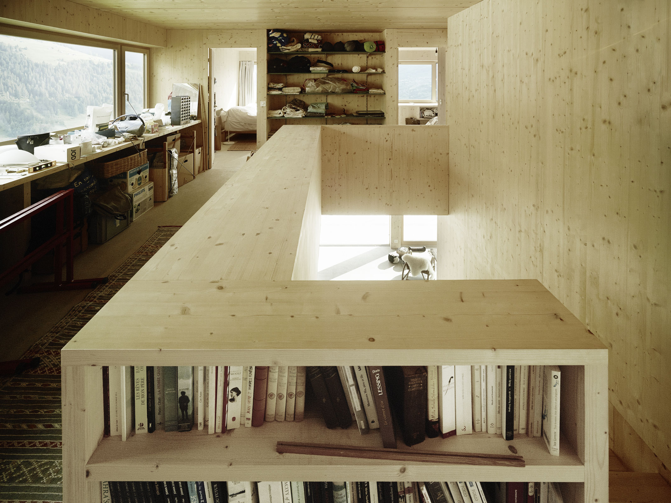 Entsprechend der Topographie tritt die talseitige Fassade volumetrisch akzentuiert in Erscheinung: Auf die landschaftlich einzigartige Aussicht ins Lugnez wird mit einer Versetzung der verschiedenen Geschosse reagiert. Die Terrasse, das obere Geschoss und das Satteldach kragen unterschiedlich weit aus, während die vollständig verglaste Öffnung des Wohn- und Essbereichs etwas zurücktreten.