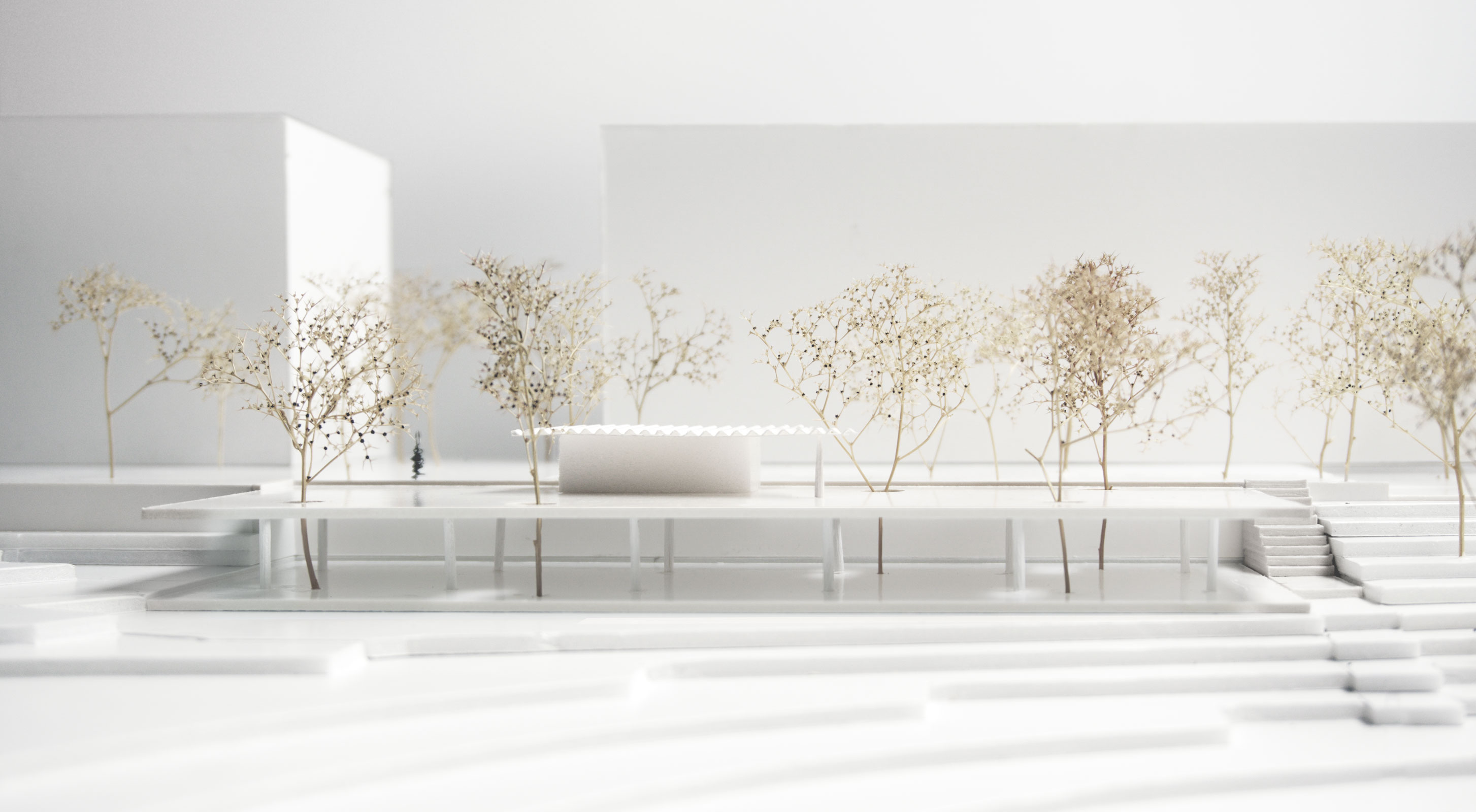 In der Zürcher Gemeinde Uitikon entsteht ein neues Quartier mit Wohnraum für 800 Personen. An dessen Eingang sind ein öffentlicher Platz mit einem Pavillon sowie eine Parkierungsanlage geplant. Mit einer einfachen Idee antwortet das Projekt auf die verschiedenen Bedürfnisse und bindet Architektur, Landschaft und Infrastruktur zusammen. Eine von Rundstützen getragene Platte sitzt wie ein Balkon in der sanft abfallenden Landschaft und bildet gleichzeitig Dach und Terrasse: unten die Parkierung, oben der Aufenthaltsbereich. Kreisrunde Öffnungen in der horizontalen Scheibe lassen Bäume von unten emporwachsen und schaffen gleichzeitig eine angenehme Lichtsituation auf der Ebene der Parkierung. Die zenital belichtete Rückwand, die perforierte Decke und der direkte Bezug zum Aussenraum verleihen der Parkierungsebene einen hellen und offenen Charakter.
