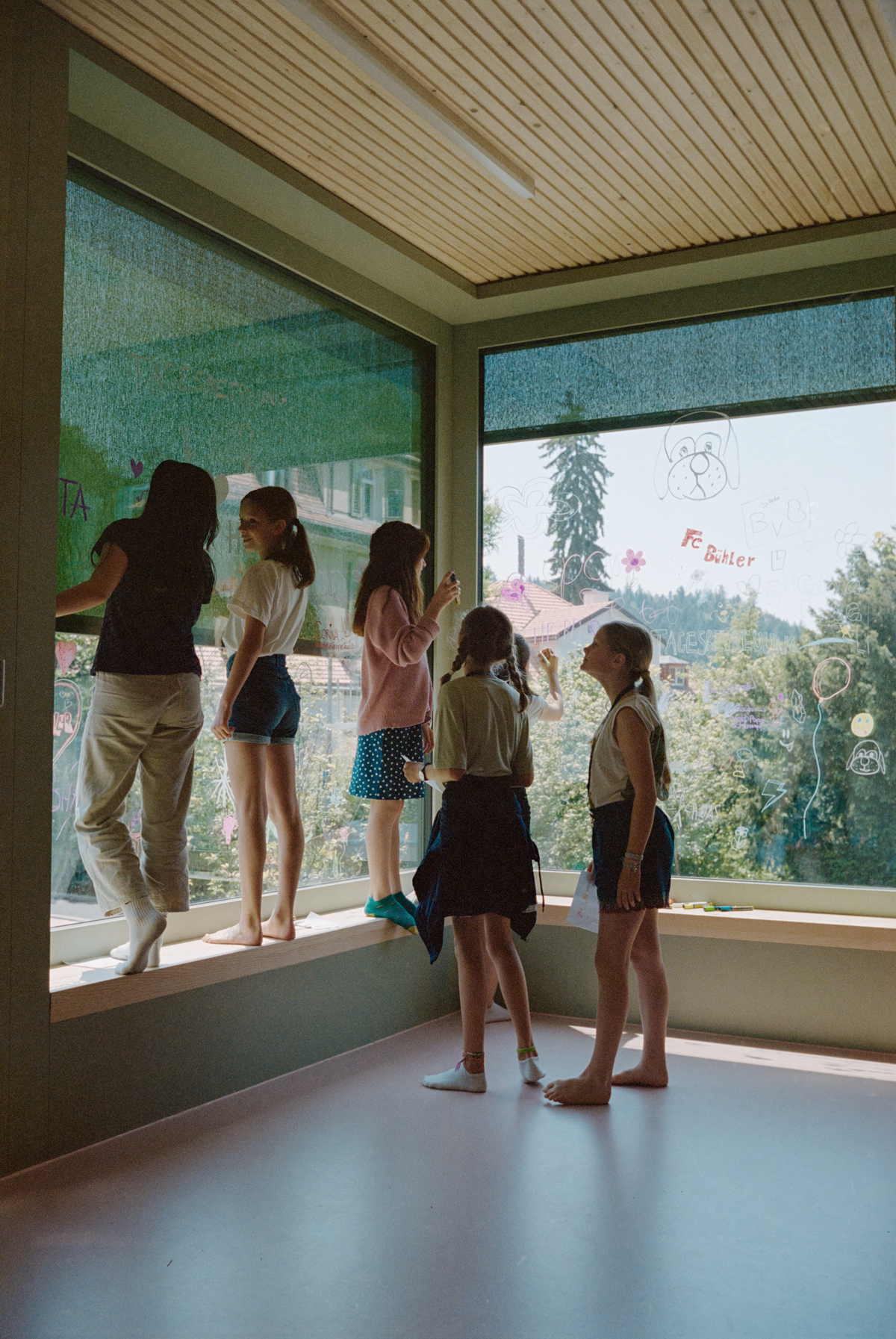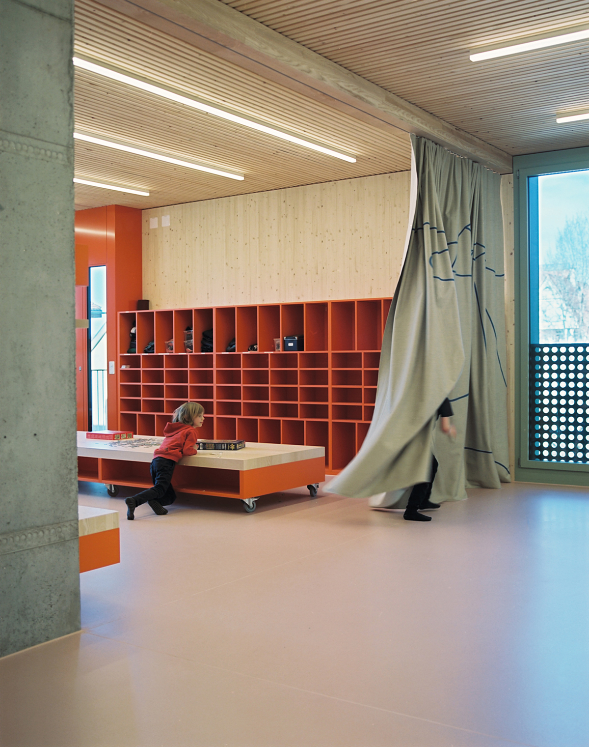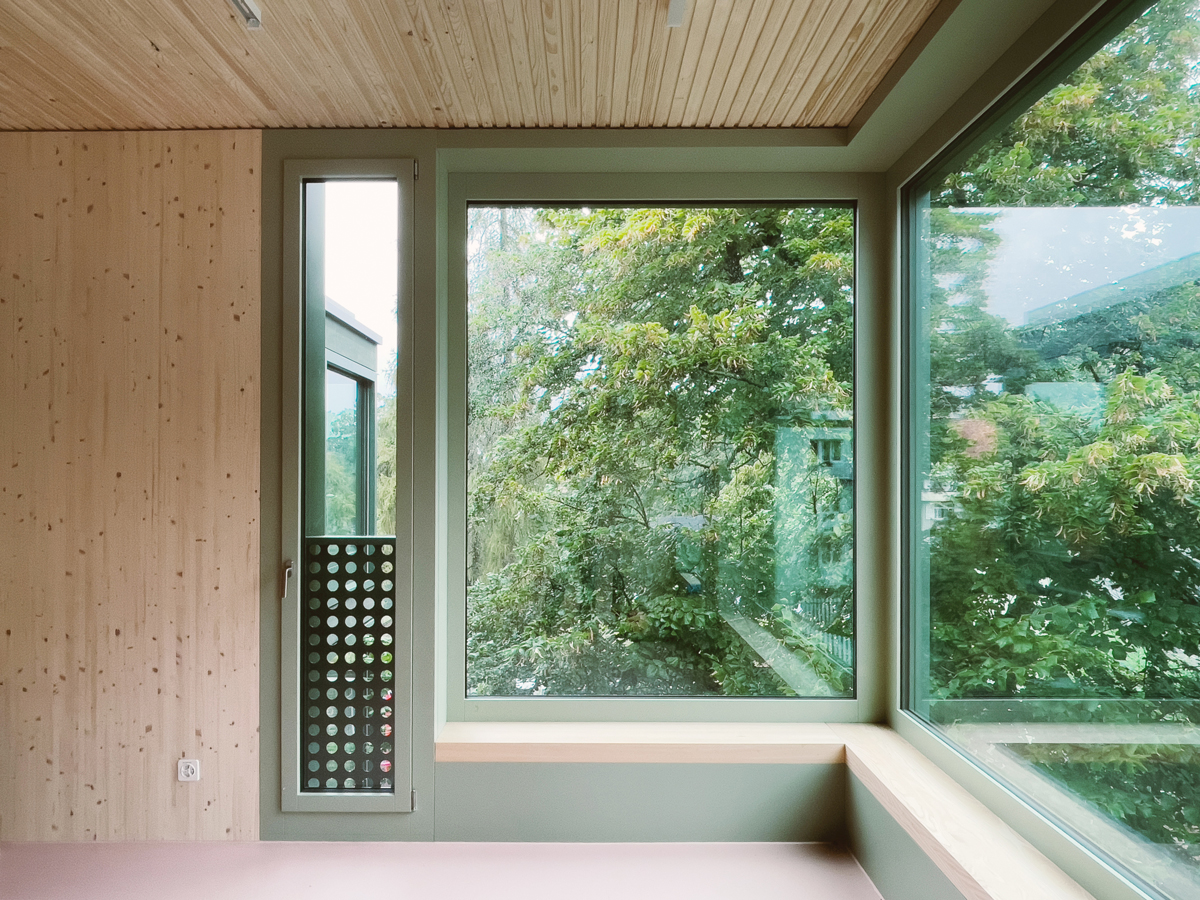Die Tagesbetreuung der Primarschule Hebel liegt mitten in St. Georgen, einem Wohnquartier im Süden der Stadt St. Gallen. Als dreigeschossiges Volumen fügt sich der Neubau mit kleinem Fussabdruck präzise in den prächtigen Baumbestand ein. Die drei Horteinheiten sind in drei übereinander liegenden Geschossen organisiert, im Sockelbereich befinden sich die Küche sowie die Räume für die Mitarbeitenden. Freie Aussentreppen folgen in ihrer Bewegung den Bäumen und bilden je einen direkten Zugang zu den drei Betreuungseinheiten, die von vielfältigen Ausblicken, optimaler Belichtung und der familiären Atmosphäre einer Geschosswohnung profitieren.
