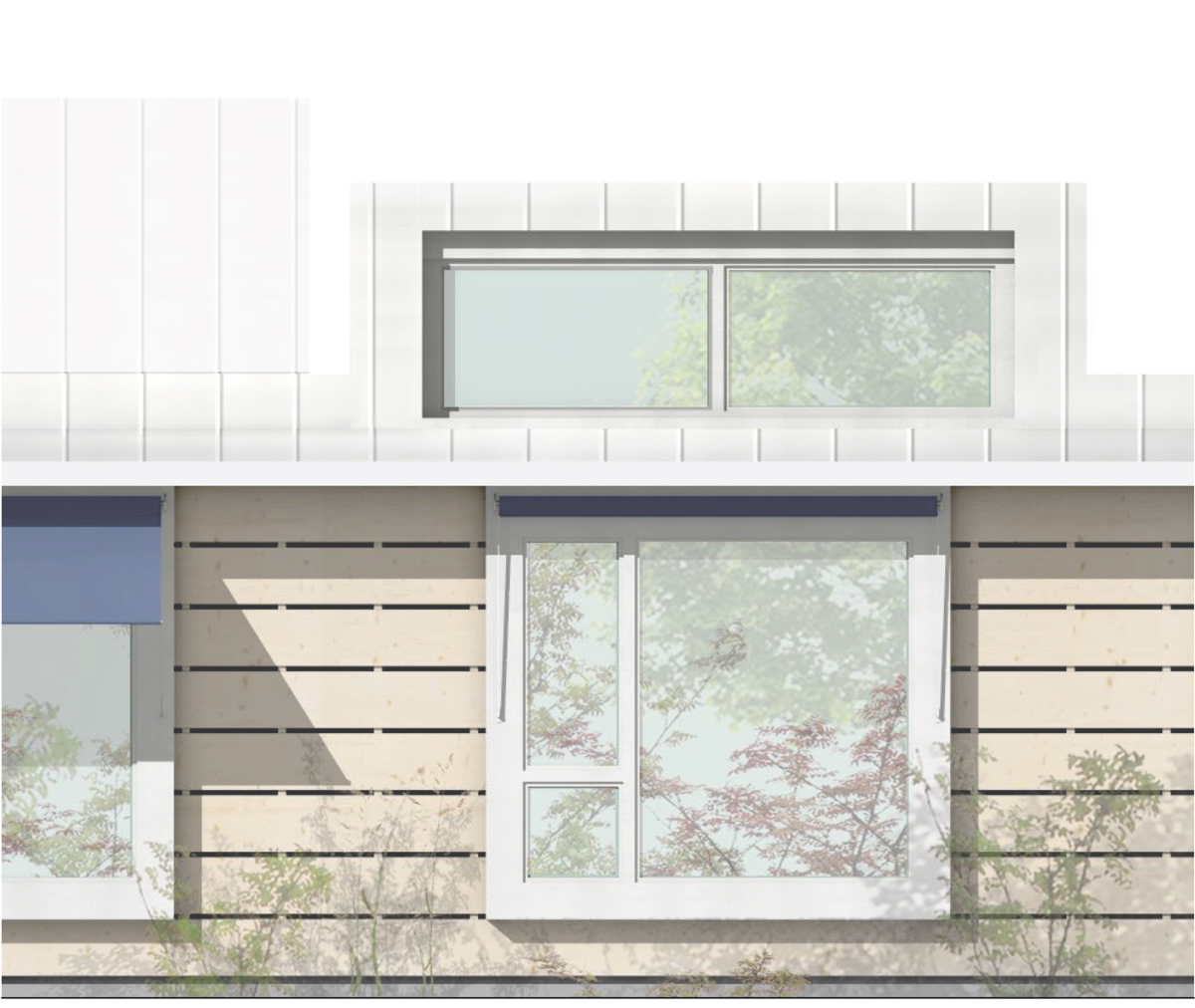 Die Aussenfassade wird allseitig mit sägerohem Nadelholz beplankt. Langgestreckte horizontale Fensteröffnungen verleihen dem Bau einen zeitgemäss grosszügigen Ausdruck.