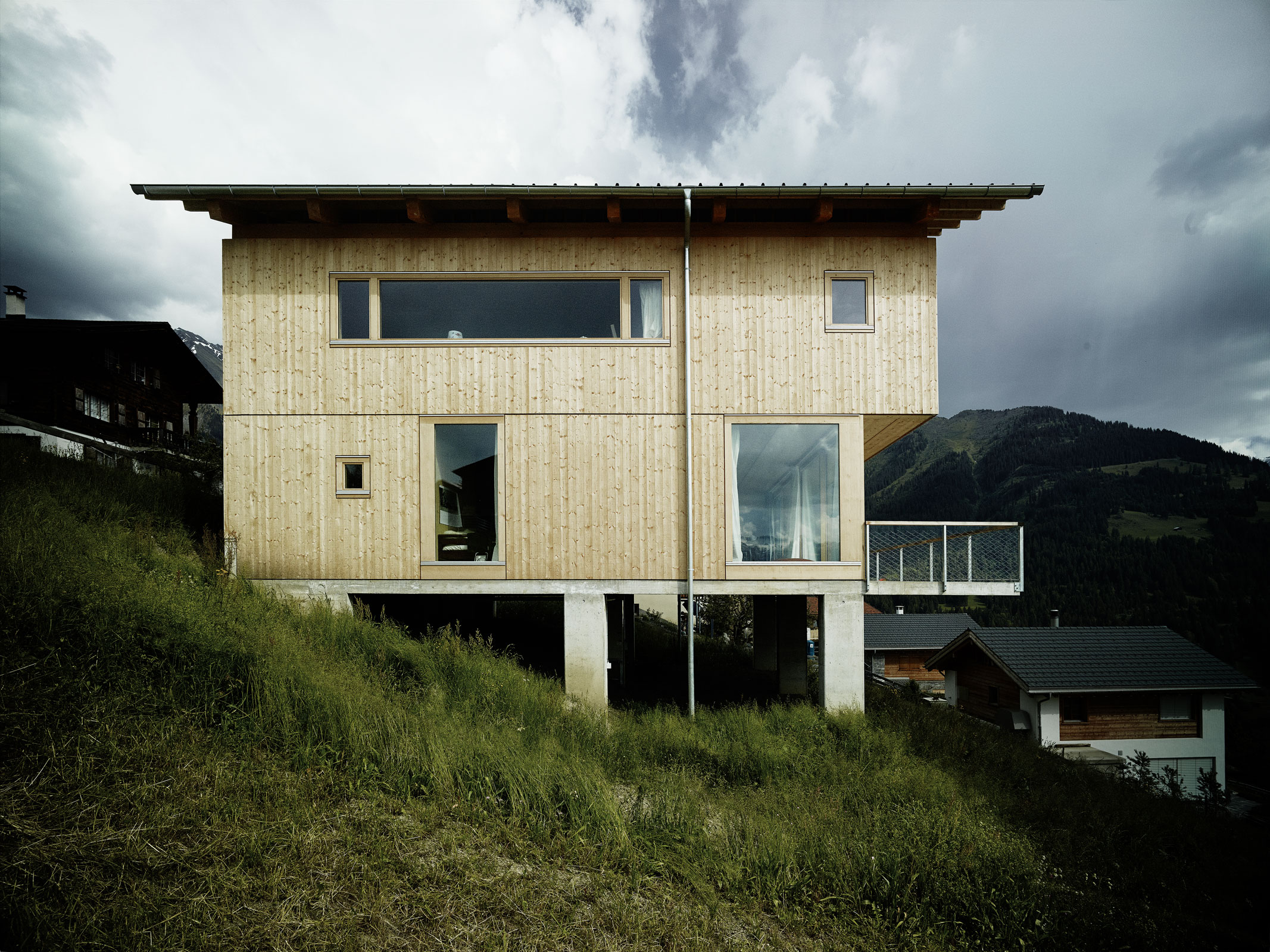 Das Haus für eine Familie mit vier Kindern liegt am Rande des Bergdorfs Riein in der Surselva. Mit dem Neubau wird die bestehende Bebauungsstruktur ergänzt und in ihrer Körnung und Typologie weitergeführt. Der steil abfallenden Hanglage begegnet das Projekt mit einem offenen Stützenfundament aus Beton, auf welchem ein zweigeschossiger Holzelementbau errichtet wird. Den Abschluss bildet ein offen belüfteter Dachstock mit einem Satteldach aus Trapezblech.