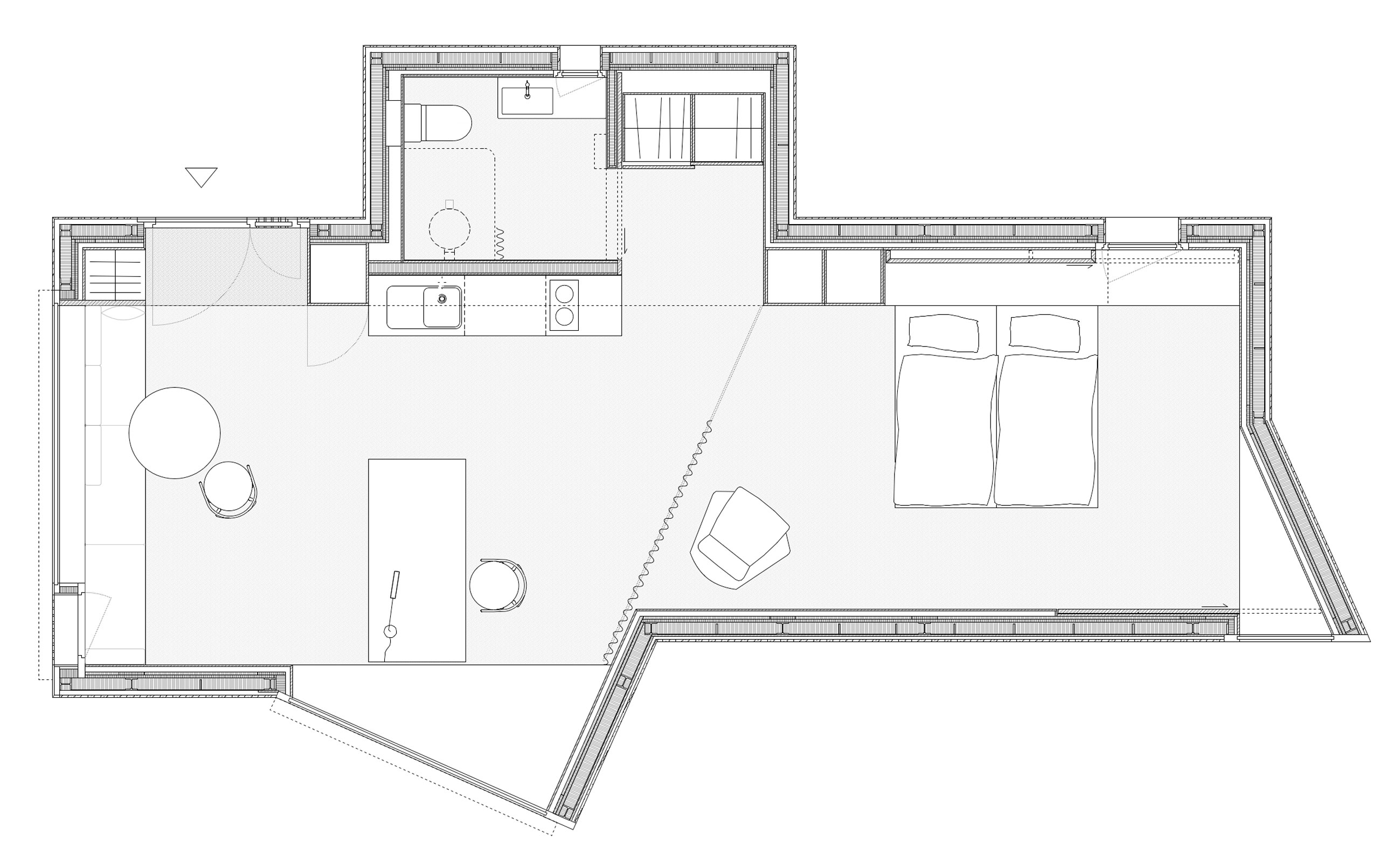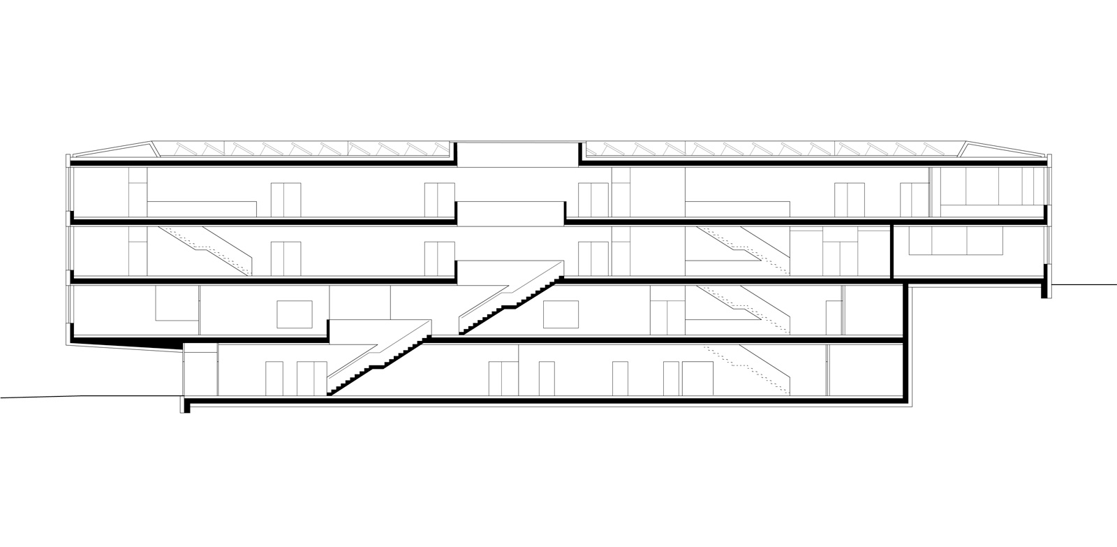 Alle Geschosse sind zweispännig angelegt. Durch die Lage quer zum Hang profitieren alle Zimmer gleichermassen vom Blick entlang der weiten Hügellandschaft und zum See. Im Mittelgang schaffen einläufige Treppen grosszügige vertikale Verbindungen. Die Tragstruktur des Gebäudes beschränkt sich auf ein Minimum, damit in der Nutzung oder zukünftigen Veränderungen eine grosse Flexibilität zur Verfügung steht.