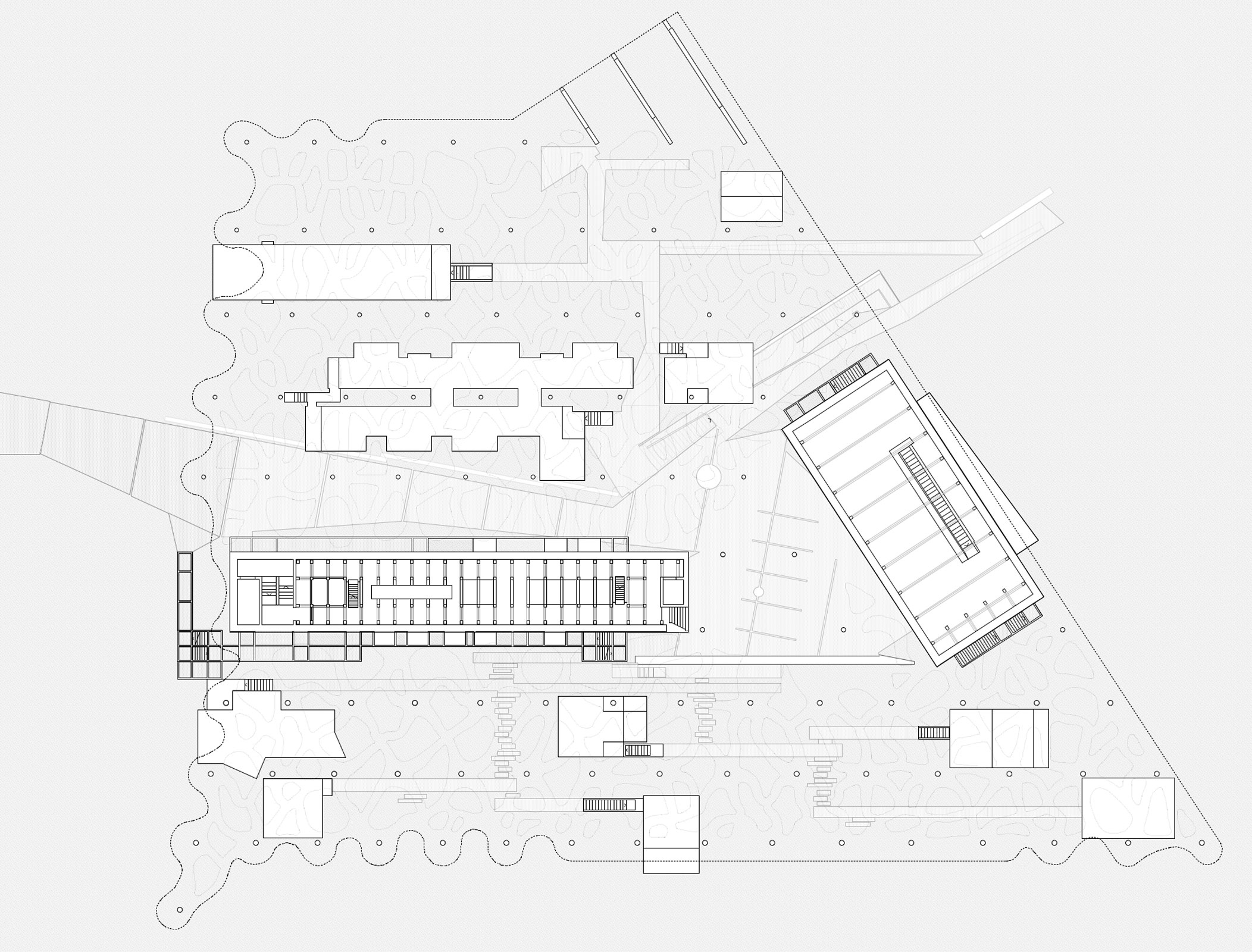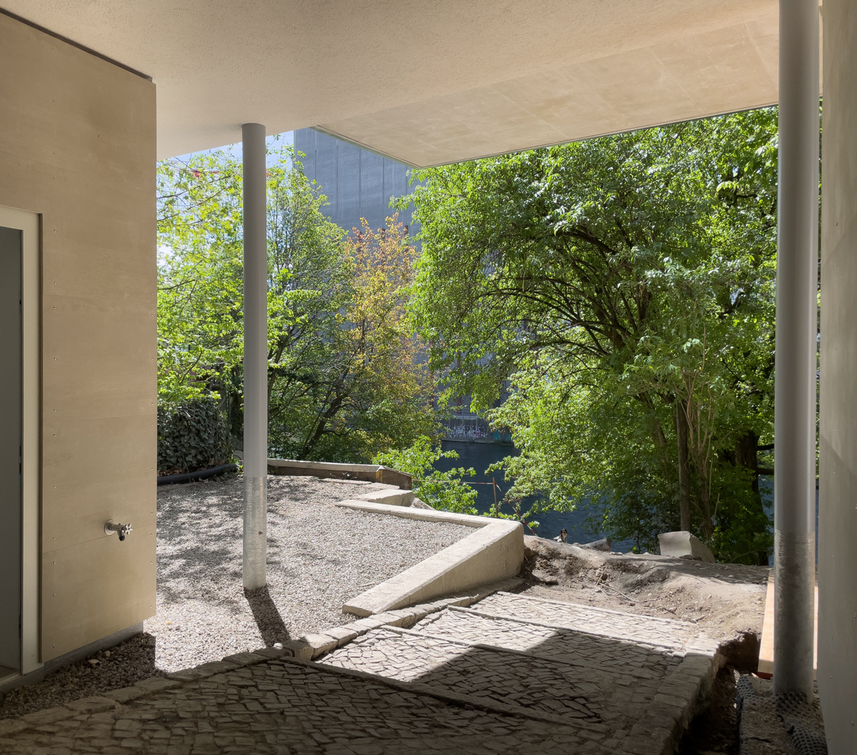 Die Topographie wird genutzt, um auf abgestuften Terrassen verschiedene spezifische Aussenräume anzulegen, die jeweils direkt den angrenzenden Innenräumen zugeordnet sind. Dies ermöglicht eine räumliche und funktionale Entflechtung der verschiedenen Aussenräume und Zugänge.