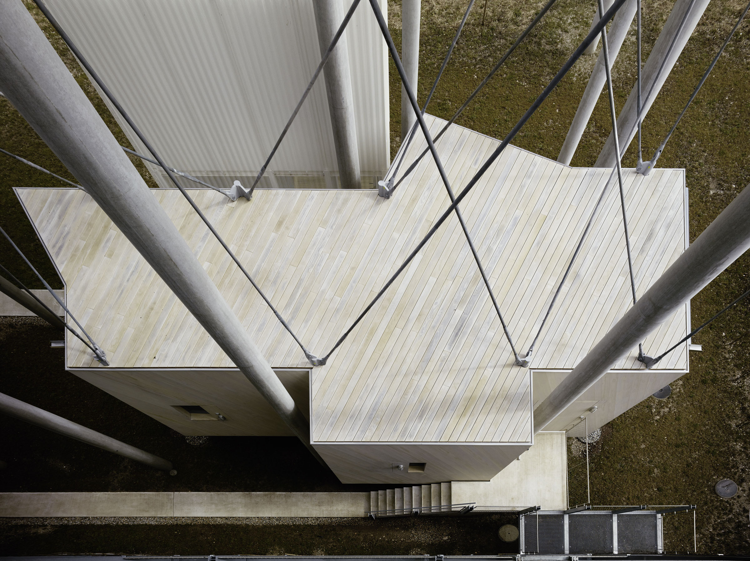 In der Zürcher Gemeinde Uitikon entsteht ein neues Quartier mit Wohnraum für 800 Personen. An dessen Eingang sind ein öffentlicher Platz mit einem Pavillon sowie eine Parkierungsanlage geplant. Mit einer einfachen Idee antwortet das Projekt auf die verschiedenen Bedürfnisse und bindet Architektur, Landschaft und Infrastruktur zusammen. Eine von Rundstützen getragene Platte sitzt wie ein Balkon in der sanft abfallenden Landschaft und bildet gleichzeitig Dach und Terrasse: unten die Parkierung, oben der Aufenthaltsbereich. Kreisrunde Öffnungen in der horizontalen Scheibe lassen Bäume von unten emporwachsen und schaffen gleichzeitig eine angenehme Lichtsituation auf der Ebene der Parkierung. Die zenital belichtete Rückwand, die perforierte Decke und der direkte Bezug zum Aussenraum verleihen der Parkierungsebene einen hellen und offenen Charakter.