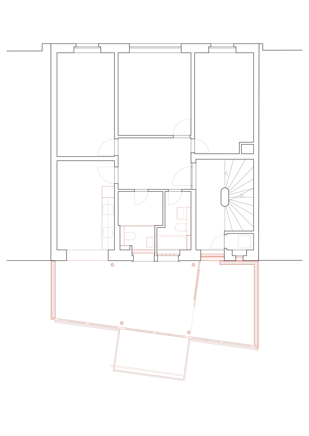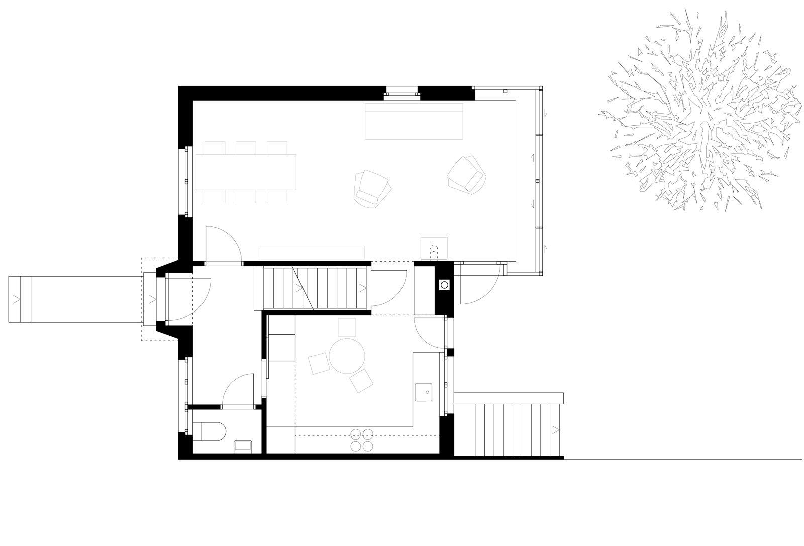 Das Reihenhaus aus den 30er Jahren liegt im «Blüemliquartier» in Zürich-Altstetten, eine denkmalgeschützte Siedlung im Geiste des Gartenstadtideals. Durch kleine lokale Eingriffe sowie durch eine Reorganisation der Bäder und des Dachgeschosses wurde das Haus auf die spezifischen Bedürfnisse der Familie angepasst. Neue Rundläufe schaffen eine Grosszügigkeit und Offenheit trotz eher kleinen Geschossflächen. Ein neuer Anbau mit Filigranverglasung erweitert den Wohnraum auf eine zeitgemässe Grösse und öffnet ihn grosszügig in den Garten mit schönem alten Obstbaumbestand.