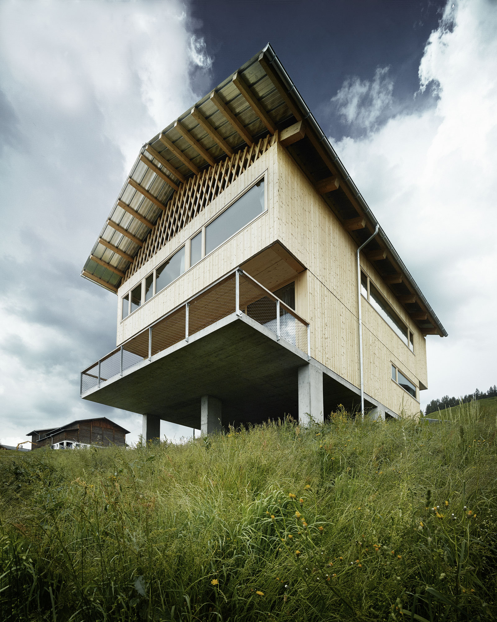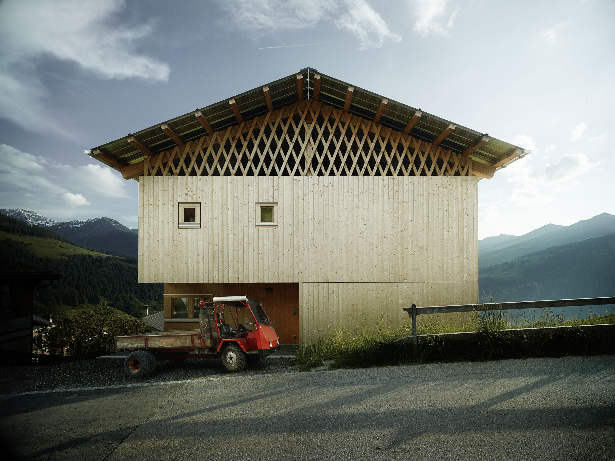 Das Haus für eine Familie mit vier Kindern liegt am Rande des Bergdorfs Riein in der Surselva. Mit dem Neubau wird die bestehende Bebauungsstruktur ergänzt und in ihrer Körnung und Typologie weitergeführt. Der steil abfallenden Hanglage begegnet das Projekt mit einem offenen Stützenfundament aus Beton, auf welchem ein zweigeschossiger Holzelementbau errichtet wird. Den Abschluss bildet ein offen belüfteter Dachstock mit einem Satteldach aus Trapezblech.