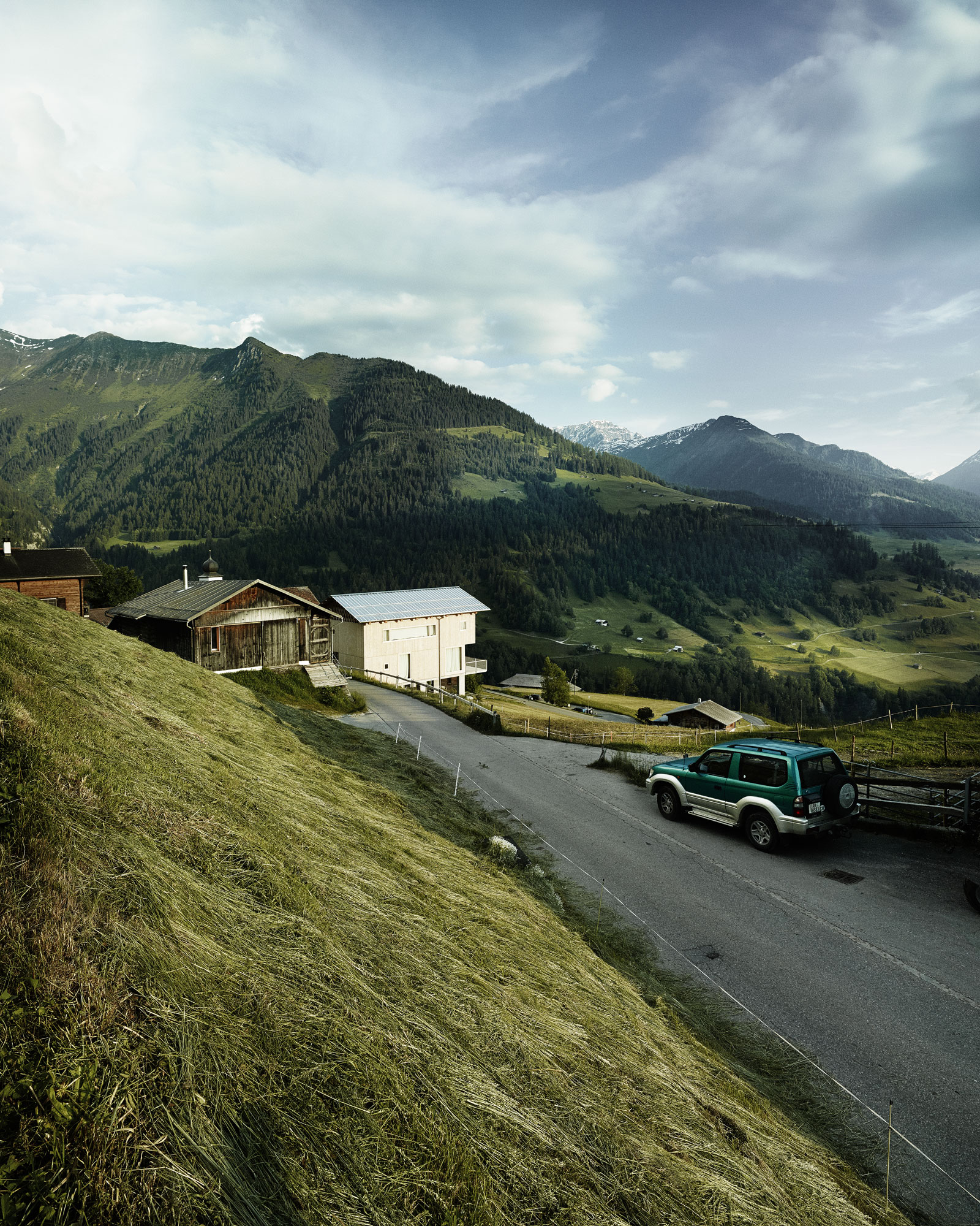 Entsprechend der Topographie tritt die talseitige Fassade volumetrisch akzentuiert in Erscheinung: Auf die landschaftlich einzigartige Aussicht ins Lugnez wird mit einer Versetzung der verschiedenen Geschosse reagiert. Die Terrasse, das obere Geschoss und das Satteldach kragen unterschiedlich weit aus, während die vollständig verglaste Öffnung des Wohn- und Essbereichs etwas zurücktreten.