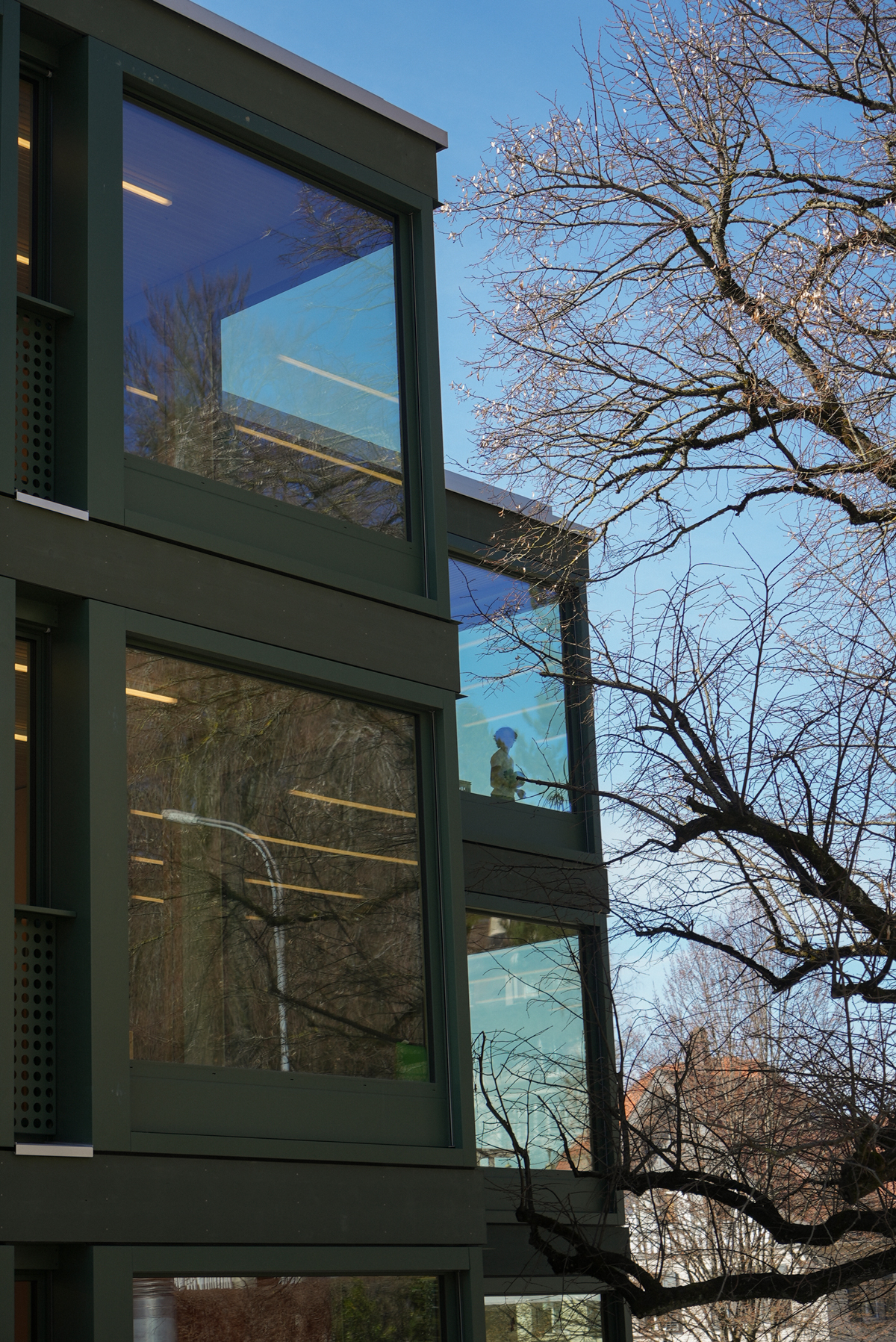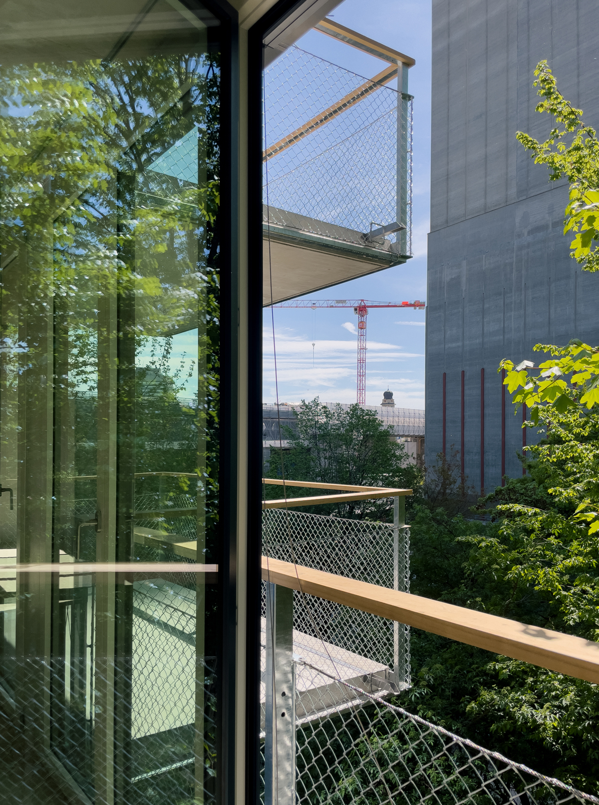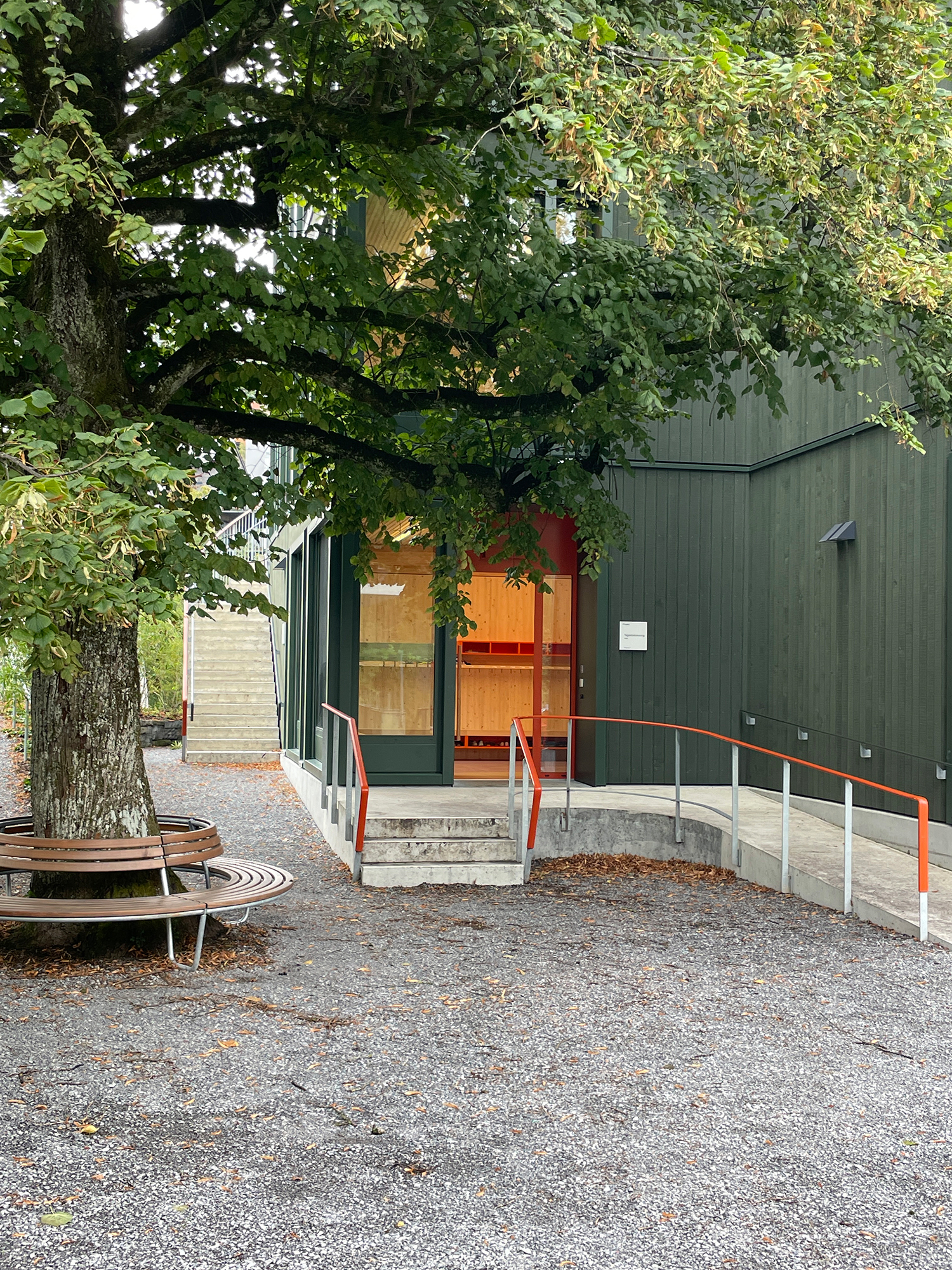 Die Tagesbetreuung der Primarschule Hebel liegt mitten in St. Georgen, einem Wohnquartier im Süden der Stadt St. Gallen. Als dreigeschossiges Volumen fügt sich der Neubau mit kleinem Fussabdruck präzise in den prächtigen Baumbestand ein. Die drei Horteinheiten sind in drei übereinander liegenden Geschossen organisiert, im Sockelbereich befinden sich die Küche sowie die Räume für die Mitarbeitenden. Freie Aussentreppen folgen in ihrer Bewegung den Bäumen und bilden je einen direkten Zugang zu den drei Betreuungseinheiten, die von vielfältigen Ausblicken, optimaler Belichtung und der familiären Atmosphäre einer Geschosswohnung profitieren.