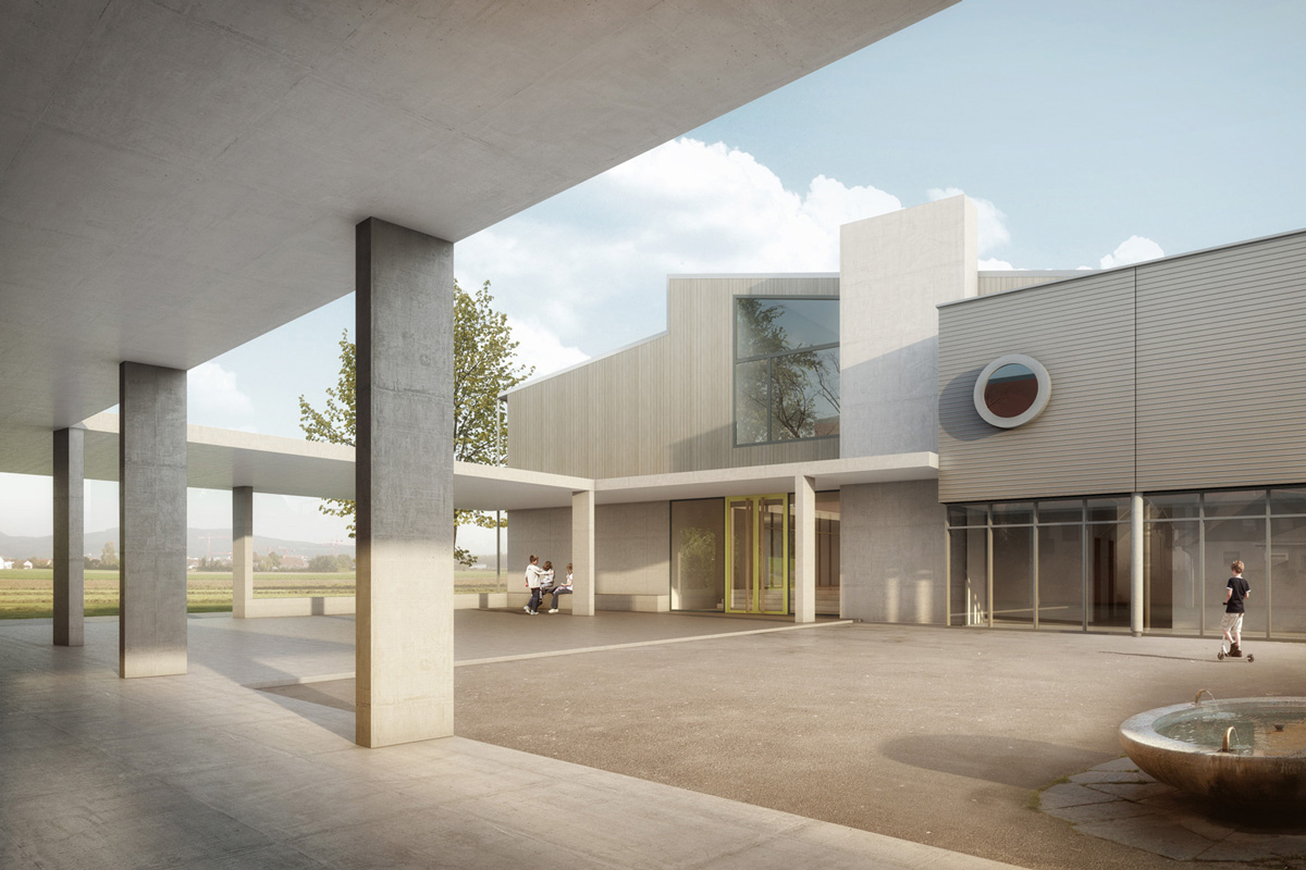 Die Schulanlage Schafisheim ist über Jahrzehnte kontinuierlich gewachsen, der Mittelpunkt bildet der Pausenhof mit einer eindrucksvollen Blickachse zwischen dem Schlössli und der weiten Landschaft. Das Projekt schlägt vor, das Gelbe Schulhaus mit einem zweigeschossigen Anbau zu erweitern. Ein übergreifendes Dach verbindet die neuen und bestehenden Bauteile zu einem neuen Ganzen. Ein nach Norden gerichtetes Oblicht in der ganzen Länge belichtet die tiefen Klassenzimmer und die beiden neuen Treppenanlagen. Der breite Mittelgang wird zum Begegnungsort für die Schüler aller Klassenstufen. Eine äussere Fassadenverkleidung in Holz verleiht dem Bau eine einheitliche Erscheinung, das ausladende Dach und die langen Brüstungsbänder unterstreichen die Horizontalität des Baukörpers. Als Kontrast zu der leichten Fassade werden im Aussenraum Elemente in Sichtbeton erstellt, die den Hauptkörper umrahmen.